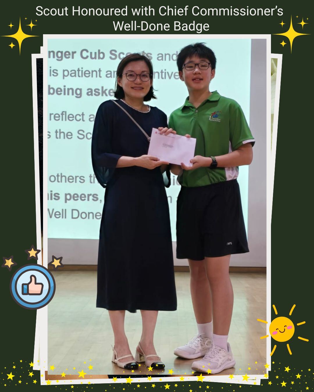 Congratulations to Matthew Chua (P6-4) on receiving the Chief Commissioner’s Well-Done Badge from the Singapore Scouts Association. Matthew exemplifies the Scout Promise through responsibility, patience and care, always supporting younger Cub Scouts and stepping in without being asked. His quiet leadership and genuine concern inspire peers, showing true Scout spirit. We are proud of you, Matthew.